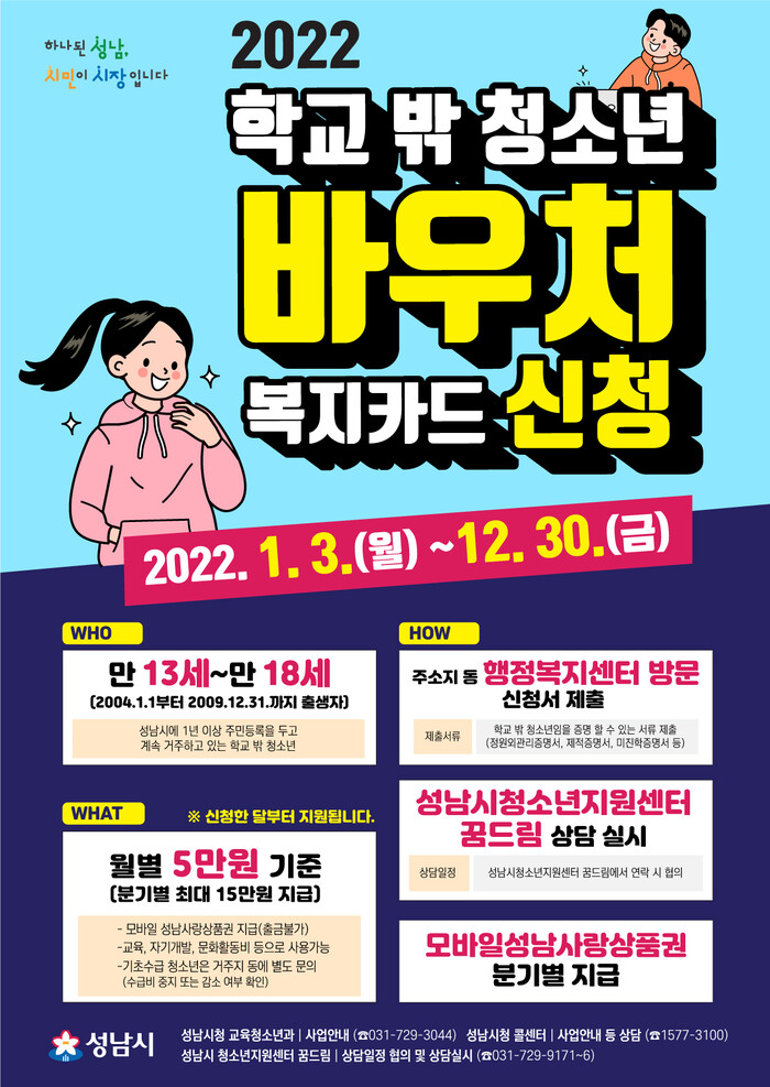 지급 대상 학교 밖 청소년은 신청일 기준 성남시에 1년 이상 주민등록을 두고 계속 거주하고 있는 2004년 1월 1일생부터 2009년 12월 31일까지의 출생자다