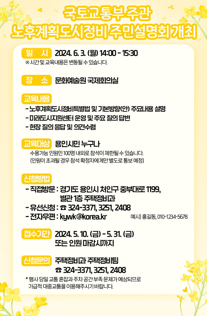 용인특례시(시장 이상일)는 6월 3일 오후 2시 시청 문화예술원 국제회의실에서 국토교통부 주관으로 ‘노후계획도시 정비사업’ 주민설명회가 열린다고 29일 밝혔다.