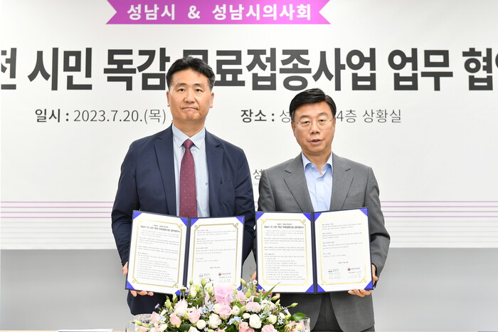 시는7월20일 오후2시 시청4층 상황실에서 신상진 성남시장과 이승혁 성남시의사회장 등이 참석한 가운데‘전 시민 독감백신 무료 접종사업 추진에 관한 업무협약’을 했다.