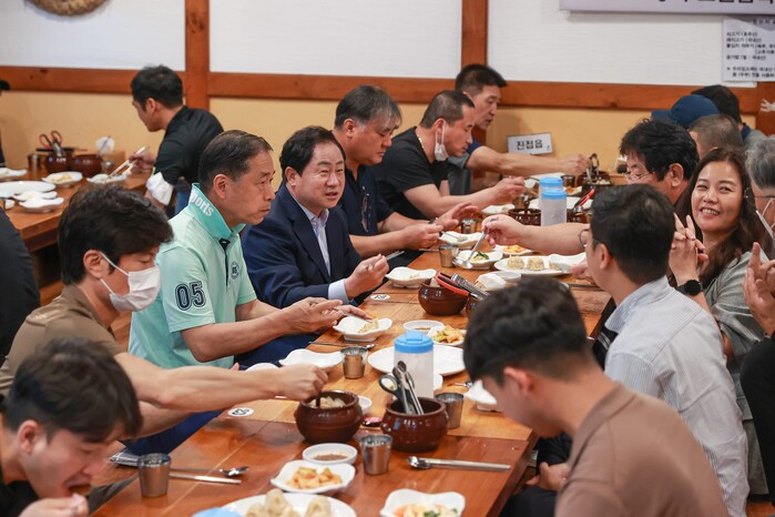 [로컬라이프] 송준형 기자 = 주광덕 남양주시장은 15일, 초복을 하루 앞두고 복대림을 함께하며, 60명 넘는 환경미화원들과 오찬 간담회를 가졌다.