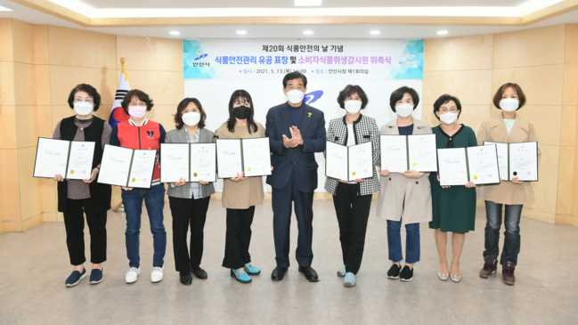 시는 지난해 코로나19 상황에서도 식품안전을 위해 노력한 위생단체, 음식점, 소비자식품위생감시원 등 식품안전관리 유공자 15명에게 안산시장 표창장을 수여했으며 소비자식품위생감시원 8명을 신규 위촉했다.