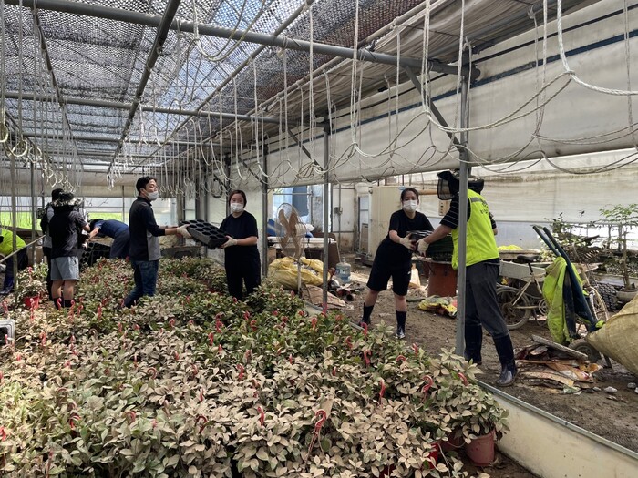 이들은 수해를 입어 침수된 농경지와 비닐하우스 내부 등에서 농작물과 화분 및 집기 등의 시설물을 정리하며 구슬땀을 흘렸다.
