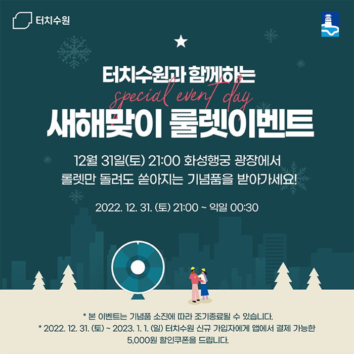 수원시는 12월 31일 오후 9시부터 화성행궁 광장에서 ‘터치수원과 함께하는 새해맞이 룰렛이벤트’를 연다.