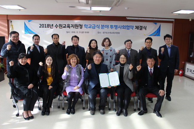 경기도수원교육지원청(교육장 최순옥)은 2018. 12. 21.(금) 학교급식의 공공성, 투명성, 책무성 강화 및 학교급식 청렴문화조성을 위해 [수원교육지원청 학교급식분야 투명사회 협약] 체결식을 가졌다.