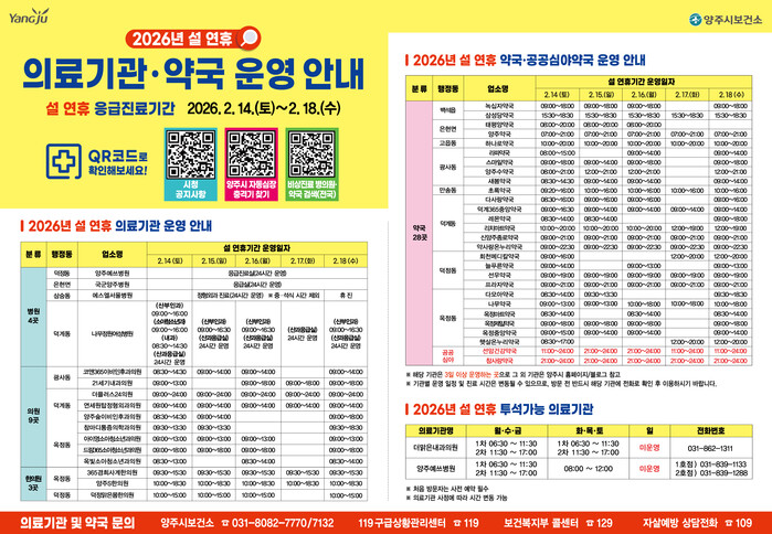 설날 연휴 기간 운영 의료기관 및 약국 정보는 ▲양주시 보건소(☎ 031-8082-7770, 7132) ▲119구급상황관리센터(☎ 119) ▲보건복지부 콜센터(☎ 129)를 통해 문의할 수 있다.