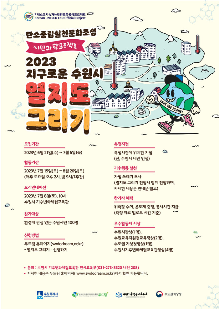 ‘2023년 열지도 그리기’는 시민이 연구원이 돼 정해진 날짜·시간에 수원시 곳곳의 온도를 측정하는 탄소중립실천문화조성 시민 과학 프로젝트이다.