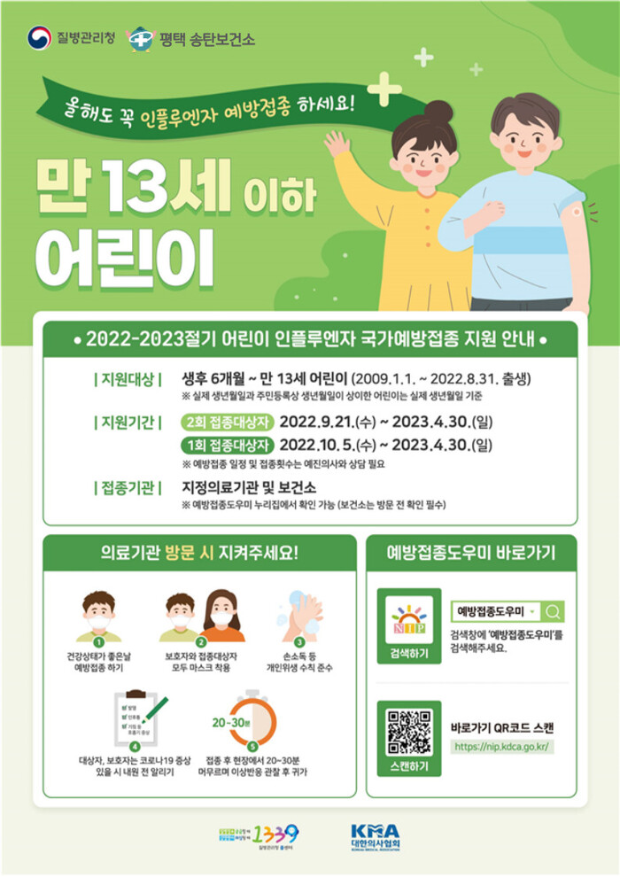 평택보건소 관계자는 “생후 6개월부터 만 13세의 어린이와 임신부는 오는 4월30일까지 무료 예방 접종 대상자에 해당하므로 늦었다 생각하지 마시고 지금이라도 지정된 의료기관에 방문하여 접종받으실 것”을 당부했다.