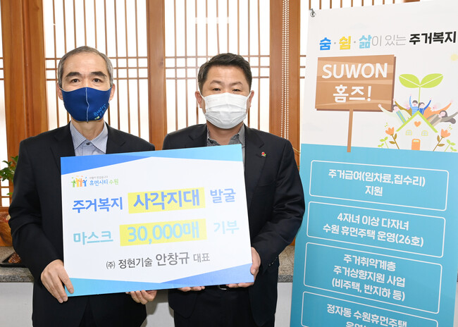 조무영 수원시 제2부시장은 “주거 위기가구 발굴을 위해 방역 필수품인 마스크를 기부해 준 ㈜정현기술의 안창규 대표께 감사드린다”며 “주거복지 사각지대 발굴에 활용해 코로나19로 어려움을 겪는 시민들에게 도움을 드릴 수 있도록 최선을 다하겠다”고 말했다.