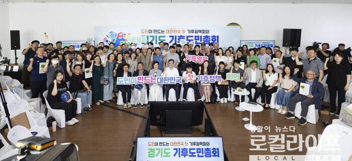 | ▲ 경기도는 '경기기후위성 1호기' 성공 발사, 기후대사 임명, 기후보험 전국 최초 시행, 국네 최초 기후정책 숙의공론 기구 '기후도민총회' 등을 통해 '경기RE100'의 성공적인 실현을 뒷받침한다는 구상이다. 사진은 2025년 6월 30일 열린 '경기도 기후도민총회 출범식' 후 김동연 경기도지사, 강금실 경기도 기후대사, 경기도 기후위기대응위원회 등 참석자들이 기념촬영을 하는 모습. (사진제공=경기도) |