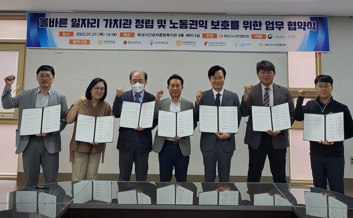 화성시(시장 정명근) 노사민정협의회가 27일 화성시근로자종합복지관에서 화성시 관내 6개 대학과 일자리가치관 정립 업무협약을 맺었다.