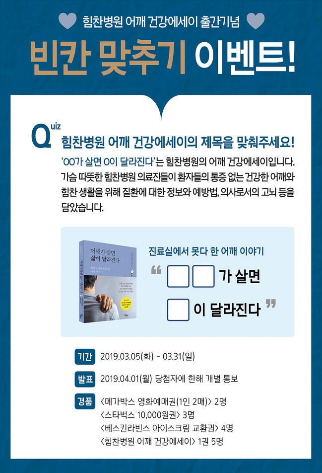 힘찬병원(대표원장 이수찬)이 어깨건강 에세이 <어깨가 살면 삶이 달라진다> 출간 기념으로 3월 5일(화)부터 31일(일)까지 ‘빈칸 맞추기 온라인 이벤트’를 진행한다고 밝혔다.