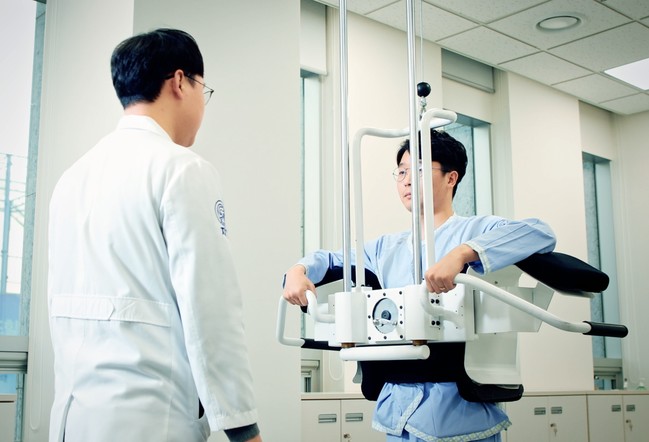 <사진/ 동작침법 원리에 착안한 치료 기구로 환자를 치료 중인 자생한방병원 의료진의 모습>