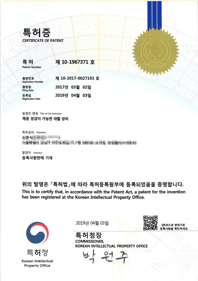 <사진/ 동작침법 원리에 착안한 치료 기구의 특허증>