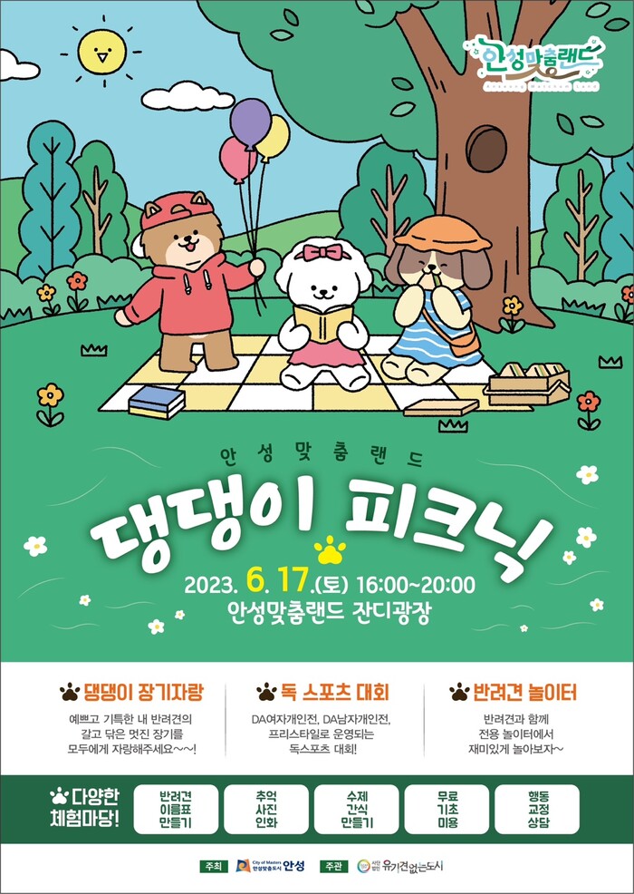안성시는 6월 17일(토) 안성맞춤랜드 잔디광장에서「댕댕이 피크닉」을 개최한다. 메인이벤트는 뜨거운 태양을 피해 오후 6시에 열린다.