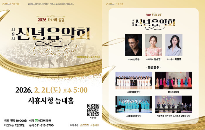 시흥시(시장 임병택)가 지원하고 (사)한국예술문화단체총연합회 시흥지회에서 주관하는 ‘2026 시흥시 신년음악회- 하나의 울림’이 오는 2월 21일 오후 5시, 시청 늠내홀에서 개최된다.