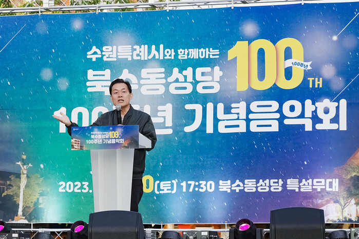 이재준 시장은 축사에서 “북수동본당은 1923년 수원지역 최초의 성당으로 첫발을 내디딘 이래 수원의 천주교 역사를 이끌어 나가는 중추적인 역할을 해왔다”며 “박해로 이곳에서 수많은 천주교인이 순교했고, 그 고결한 희생을 인정받아 수원의 유일한 성지로 선포됐다”고 말했다.
