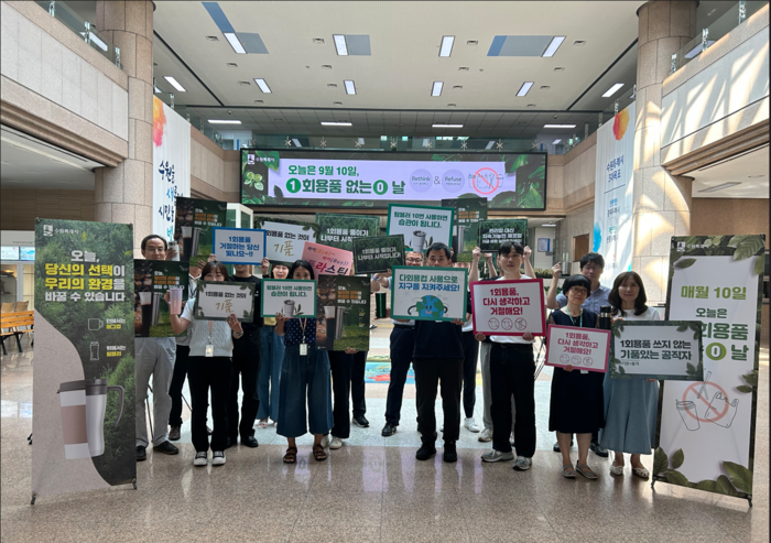 수원시는 6일 제15회 ‘자원순환의 날(9월 6일)’을 맞아 시청 본관에서 플라스틱 사용을 줄이기를 독려하는 ‘바이바이 플라스틱’ 캠페인을 펼쳤다.