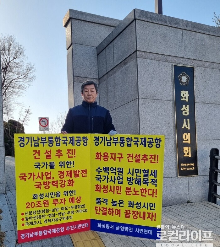[화성=로컬라이프] 임현상 기자 = '경기남부통합국제공항 화성 유치'를 촉구하는 1인 시위가 지역 시민단체 주도로 총선 투표일 직전인 내달 8일까지 진행된다.