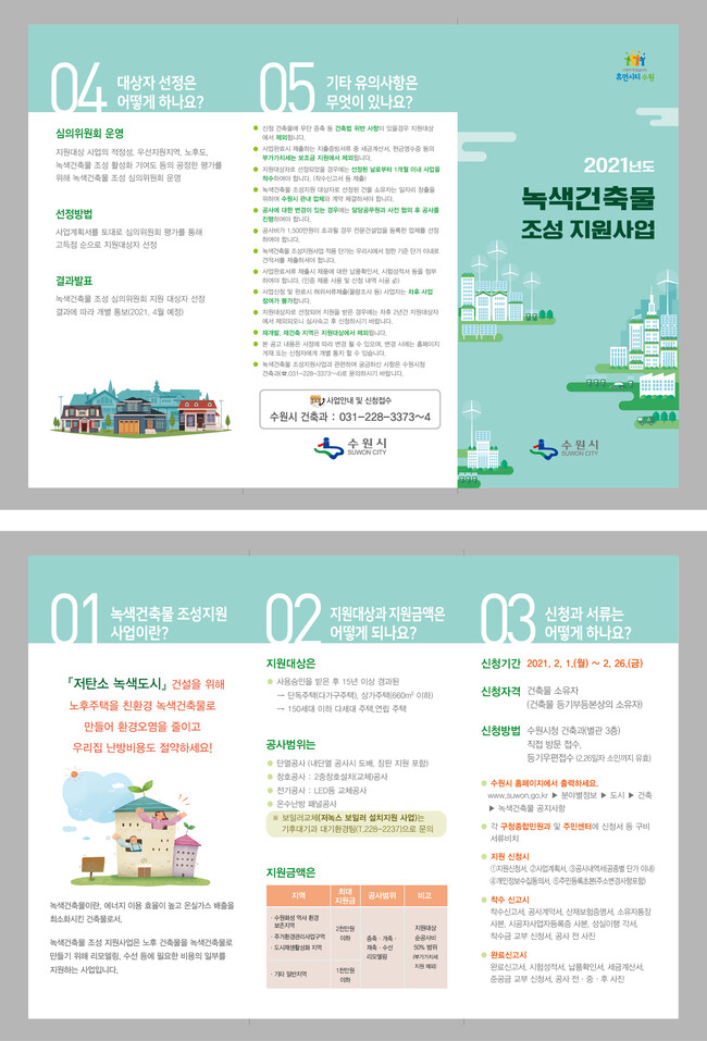 수원시 홈페이지(www.suwon.go.kr) ‘공고/고시/입법예고’에 게시된 ‘2021년 녹색건축물 조성 지원사업 모집공고’에서 자세한 내용을 확인할 수 있다.