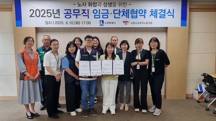 수원시와 수원시공무직노동조합은 10일 시청 귀빈실에서 ‘2025년 공무직 임금·단체협약’을 체결했다.