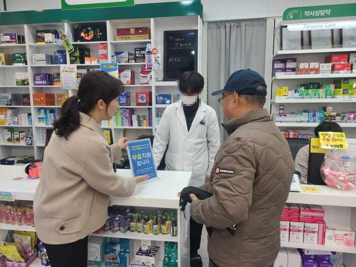 사진/약국에서 방문객에게 치매관리사업을 홍보하고 있다.(사진제공=수원시)