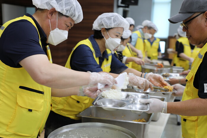 사진/상반기 수원 ‘사랑의 밥차’에서 급식 봉사활동하고 있는 자원봉사자들.(사진제공=수원시)