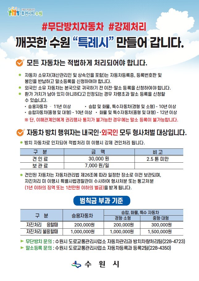 수원시는 외국인의 자동차 무단 방치를 방지하기 위해 자동차 적법처리 방법 등을 알리는 홍보물을 4개 국어로 제작해 동행정복지센터, 외국인 관련 기관 등에 배부했다.