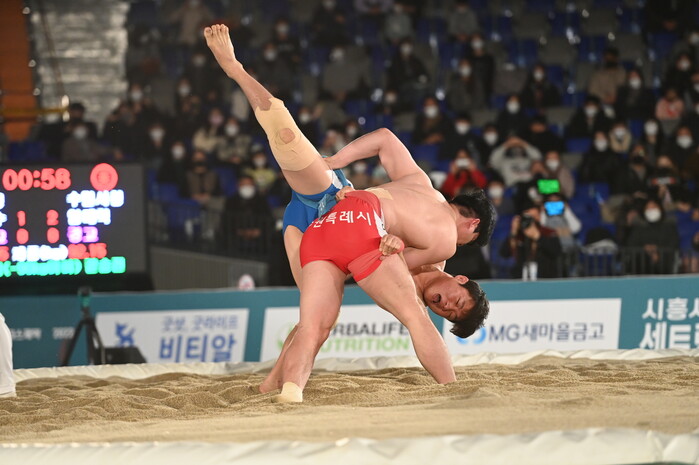 사진/수원에서 열린 2022 설날장사씨름대회 결승에서 경기를 하고 있는 임태혁 선수 모습.(사진제공=수원시)
