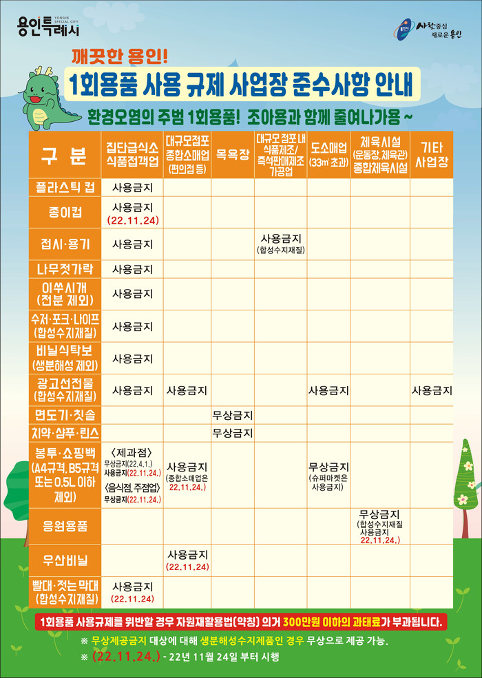 용인시는 카페 등 식품접객업 매장에서 컵·접시·수저 등 일회용품 사용 금지에 따른 과태료 처분을 유예한다고 8일 밝혔다.