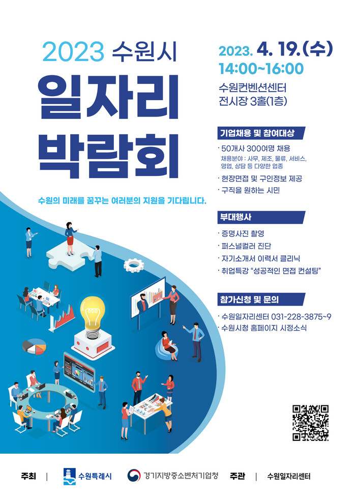 수원시는 19일 오후 2시부터 4시까지 수원컨벤션센터 전시장 3홀에서 ‘2023 수원시 일자리박람회’를 개최한다.