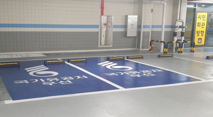 국가유공자 우선 주차구역은 주차 편의와 안전을 고려해 주차장에서 시민회관 방면 엘리베이터 바로 앞에 2면을 확보해 설치하고 ‘국가유공자 우선’ 문구를 표시했다.