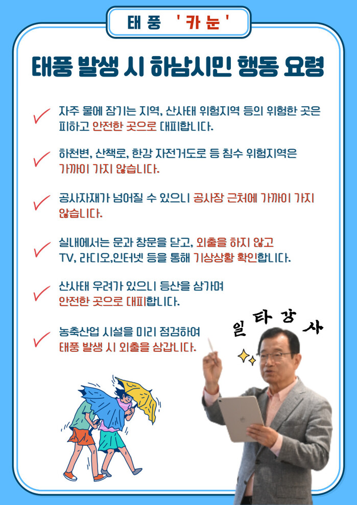 [로컬라이프] 송준형 기자 = 이현재 하남시장은 9일, 하남시민 여러분께 태풍 발생 시 행동요령에 대해 안내 드린다고 위와 같이 밝혔다.