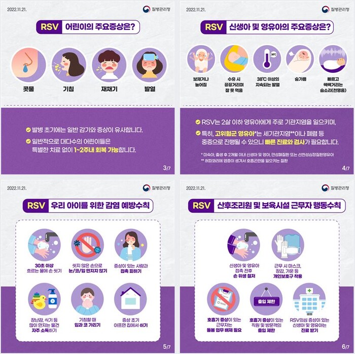 호흡기세포융합바이러스 감염증이란 매년 10월부터 다음해 3월까지 유행하는 급성호흡기감염증으로, 감염된 사람의 호흡기 비말에 노출되거나 오염된 물건에 접촉 후 눈, 코, 입 주위 등을 만졌을 경우 전파된다.