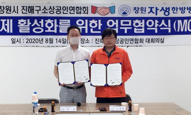 창원자생한방병원(병원장 강인)은 14일 진해구소상공인연합회와 신종 코로나바이러스 감염증(코로나19)으로 침체된 지역경제 활성화 및 소상공인 건강증진을 위한 업무협약(MOU)을 체결했다고 밝혔다.