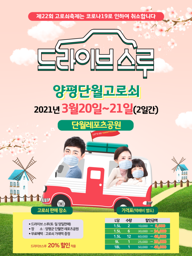 양평의 따뜻한 봄을 여는 단월고로쇠축제는 코로나19의 영향으로 그 간 대면방식의 축제에서 벗어나 보다 더 안전하고 편리하게 드라이브스루(차량탑승구매) 방식으로 행사가 진행되며, 시중가보다 20% 할인 된 가격으로 판매한다.