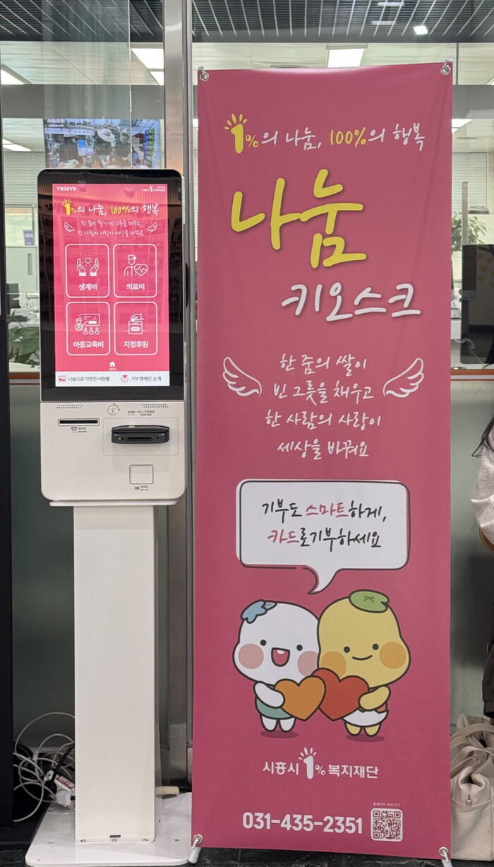 시흥시(시장 임병택)는 시민들이 일상에서 손쉽게 기부에 참여할 수 있도록 시흥시1%복지재단에서 지난 4월 시흥시청 민원여권과 앞에 ‘나눔 키오스크(무인 단말기)’를 설치할 수 있도록 지원했다고 밝혔다.