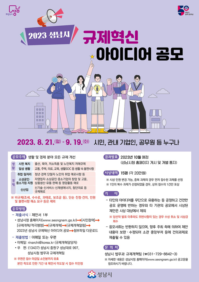 성남시는 오는 9월 19일까지 규제혁신 아이디어를 공모한다.