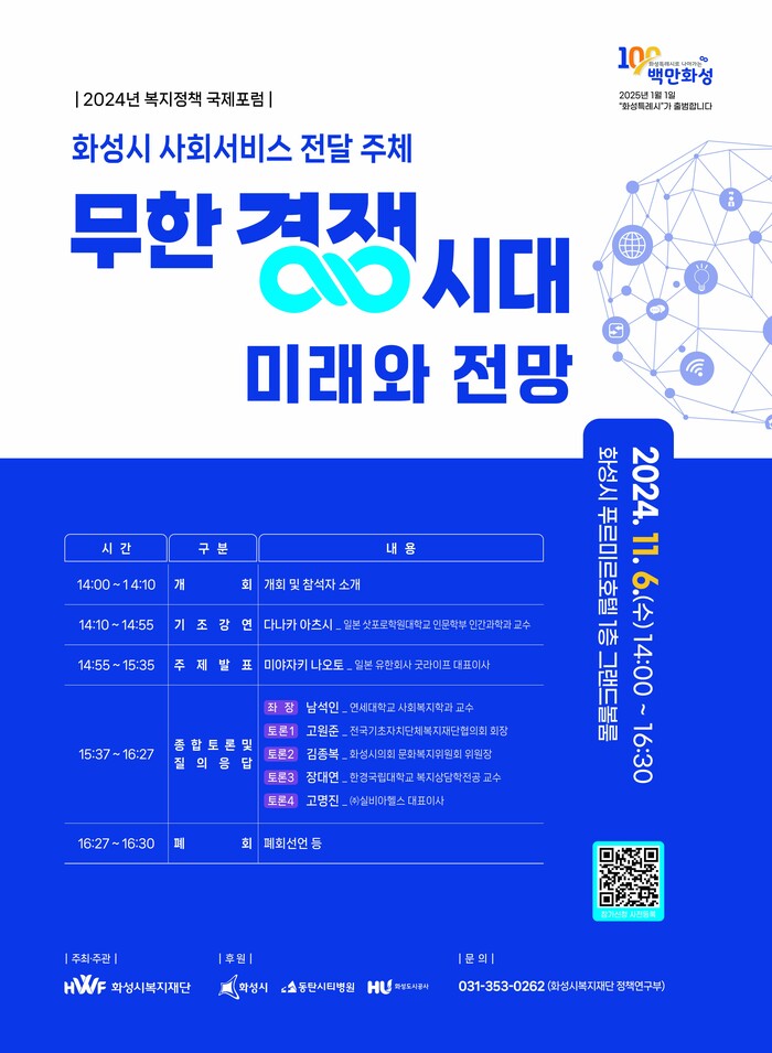 포럼 참여 신청은 홍보 포스터 QR코드 및 화성시복지재단 홈페이지에서 통사전 등록할 수 있다. 문의는 화성시복지재단 정책연구부(031-353-0246)로 하면 된다.