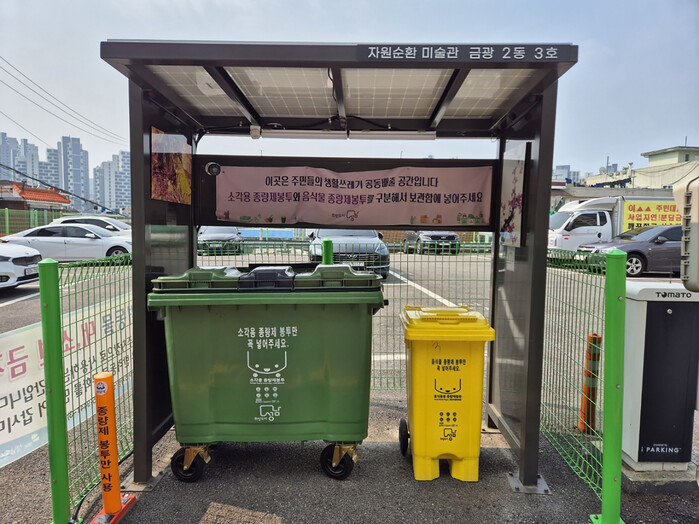자원순환 미술관(55곳)은 태양광 패널 지붕이 달린 철제 구조물을 설치해 양쪽 벽면에 그림을 걸어 전시하고, 구조물 안에 소각용 쓰레기 종량제 봉투 보관함(660ℓ)과 음식물 쓰레기용 종량제 봉투 보관함(120ℓ)을 비치하는 방식이다.