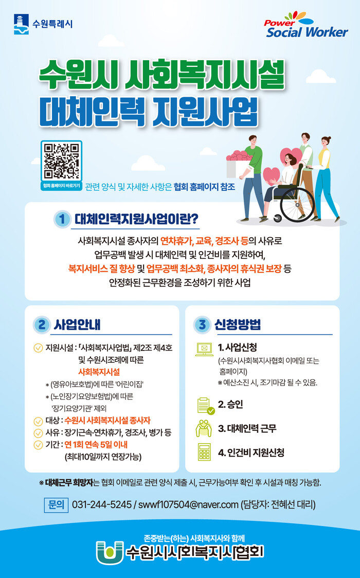 수원시가 사회복지시설에서 단기결원이 발생했을 때 대체인력의 인건비를 지원하는 ‘수원시 사회복지시설 대체인력 지원사업’을 개시했다. 총사업비는 3000만 원이다.