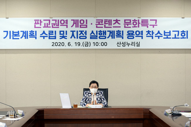 시는 6월 19일 오전 10시 시청 3층 산성누리에서 은수미 성남시장 등 20명이 참석한 가운데 ‘판교권역 게임·콘텐츠 문화 특구 기본계획 수립 및 지정 실행계획 용역 착수보고회’를 했다.