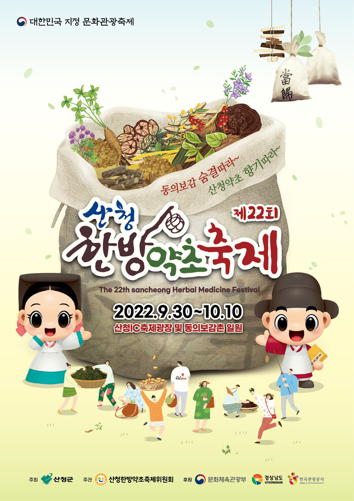 경상남도 산청군은 '제22회 산청한방약초축제'를 9월 30일부터 10월 10일까지 열하루 동안 산청IC 입구 축제광장과 동의보감촌 등 산청군 일원에서 개최할 예정이다.