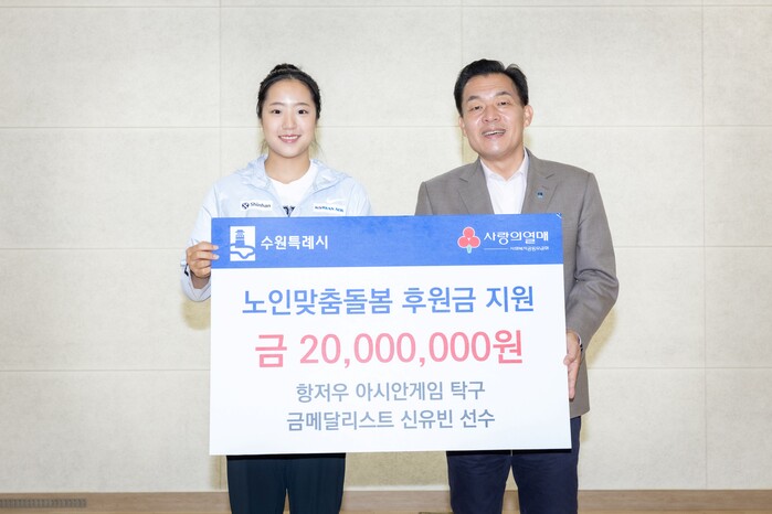 항저우 아시안게임 탁구 여자 복식에서 금메달을 획득한 신유빈 선수가 “홀로 사는 저소득층 어르신에게 전달해 달라”며 수원시에 ‘노인맞춤돌봄 후원금’ 2000만 원을 기탁했다.