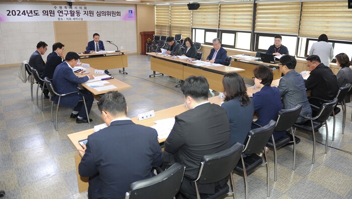 수원시의회는 15일 의회 세미나실에서 ‘수원시의회 의원연구활동 지원 심의위원회’(위원장 강영우)를 열고 2024년도 의원연구단체의 등록과 연구활동 계획 승인에 관한 사항을 심사하였다.