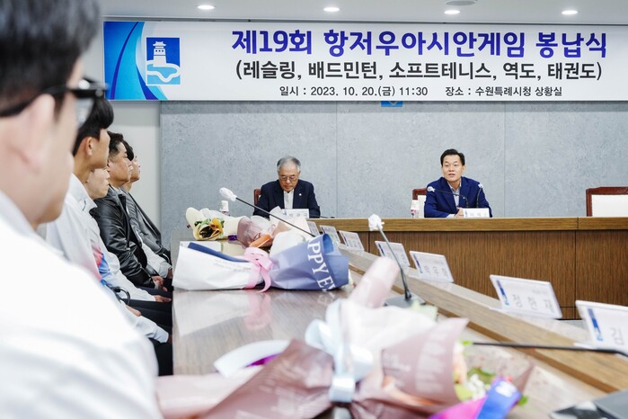 시청 상황실에서 열린 봉납식에는 이재준 수원특례시장을 비롯해 방광국 수원시체육회장, 항저우아시안게임 출전선수, 지도자(감독) 등 23명이 참석했다.