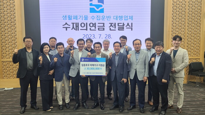 수원시 관계자는 “지난해에 이어 올해도 수재의연금을 기부해 주신 생활폐기물 수집·운반 대행업체협회에 감사드린다”며 “시름에 빠진 수재민들에게 큰 힘이 될 것”이라고 말했다.