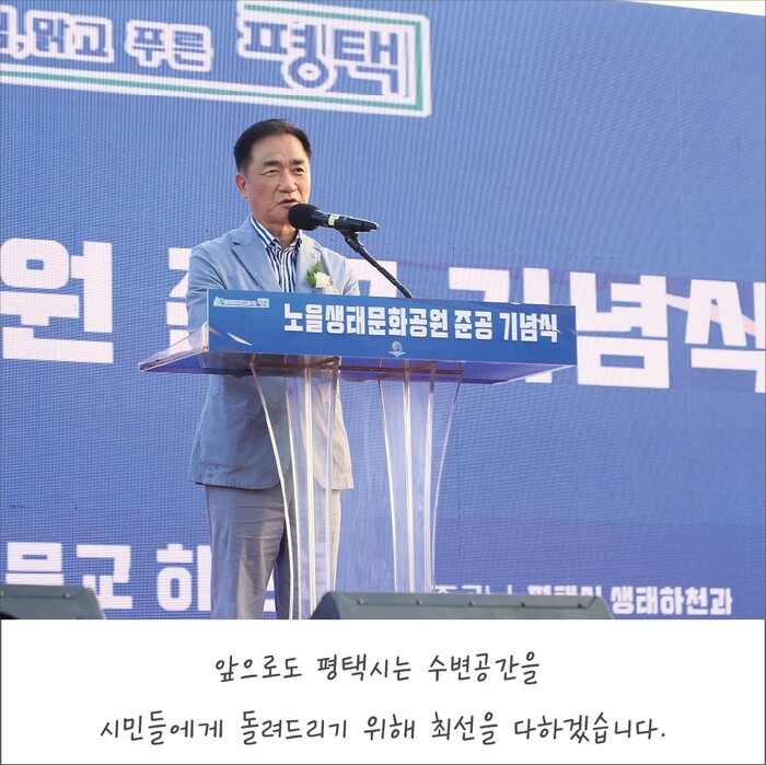 이와 관련해 정장선 평택시장은 28일, 자신의 페이스북을 통해 노을생태문화공원은 자연 생태계를 최대한 활용하면서도 물놀이장, 다목적트랙, 피크닉장 등 다양한 시설이 마련됐다고 밝혔다.