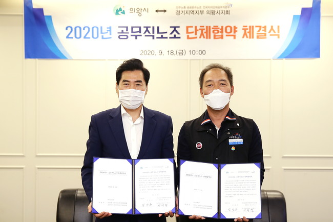 [로컬라이프] 의왕시는 18일 시청 접견실에서 공공운수노조 의왕시공무직지회와 ‘2020년 단체협약 체결식’을 가졌다.