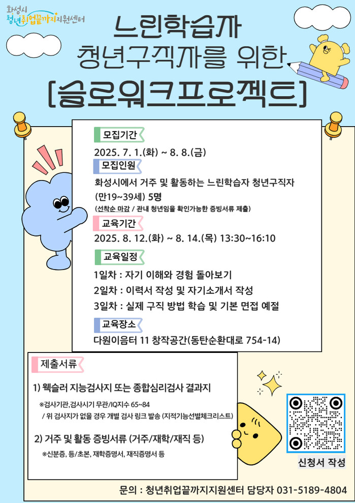 지원 자격은 화성시에서 거주 및 활동하는 느린학습자 청년(19세~39세) 구직자로, 총 5명을 모집한다.