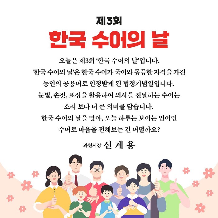 [로컬라이프] 송준형 기자 = 신계용 과천시장은 3일, 제3회 ‘한국 수어의 날’을 축하한다고 말했다.